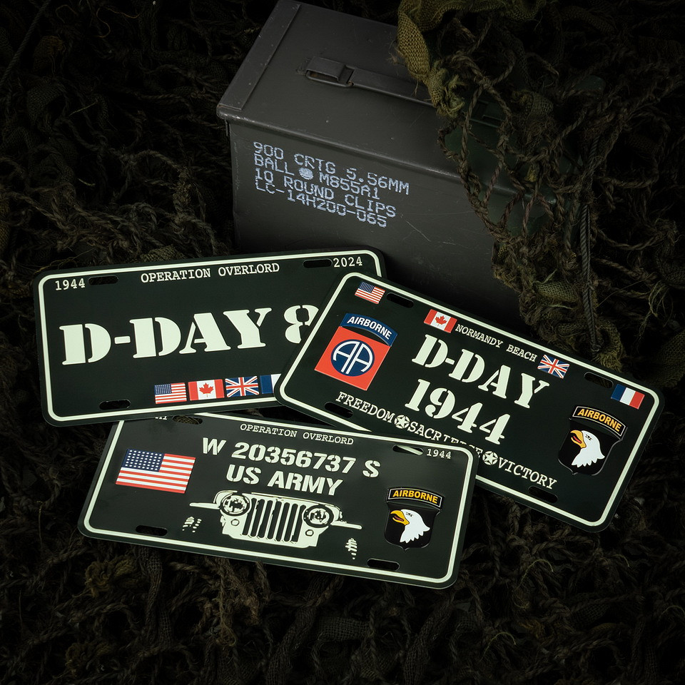 Check ons nieuwe Nummerplaat D-Day Willys. De nummerplaat heeft een D-Day/ Operation Overlord thema en verder staan er mooie emblemen op zoals de Amerikaanse vlag en Airborne. Perfect om in je huis aan de muur op te hangen!